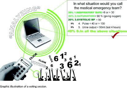 In an ARS session, a computer connected to a projector and a signal receiver is used. All participants are supplied with a voting unit which costs about 40 euros. The ARS programme collects votes during the lecture and the software automatically saves all data. Voting questions are designed in PowerPoint using the Turning Point software. The voting function may be adjusted according to the aim of the questions. Voting answers may be displayed immediately as a graph or kept hidden from the participants.
