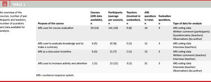 Results: A total of 215 participants and 12 teachers were included. The majority of the participants found ARS suitable for course evaluation. The teachers found it useful for obtaining the results immediately and thereby for receiving feedback on their own teaching. The participants and the teachers found ARS suitable for knowledge testing. ARS was used as an instrument to increase activity and attention. The system was found to increase the level of concentration and the interactivity. ARS was used to initiate discussions. The participants found that the questions could be a good starting point for discussion. The teachers found it challenging to comment on answers. Our experiences are that thorough planning and preparation is needed for the successful implementation of ARS.