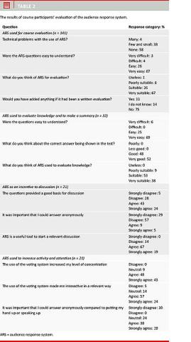Conclusion: Our experiences indicate that ARS is suitable for course evaluation. Overall, we find ARS a valuable technology that may stimulate discussion and support learning, but teachers need to be technically and pedagogically well prepared to use the tool. The use of ARS does not in itself entail that the quality of the teaching increases.