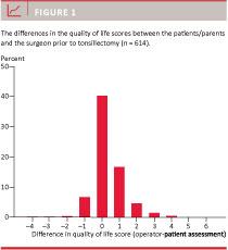 The patients’ QoL prior to the tonsillectomy was scored by the patients/parents as well as the surgeons (Figure 1). In general, the surgeons noted higher QoL scores for the patients than the patients themselves (signed rank: 6,976, p < 0.0001). Thus, concordance between the scores was found in 40% of cases.
