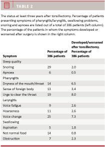 There may be several reasons for the persistence, worsening, recurrence or development of symptoms after tonsillectomy. It has been proposed that removal of the tonsils might harm the immune system and cause a condition of chronic pharyngitis/laryngitis. On the other hand, it has been postulated that tonsillectomy would be beneficial in case of chronic or recurrent tonsillitis due to inadequate immune function of the palatine tonsils. However, tonsillectomy has presently not been proven to have any significant effect on the immune system [1]. It might be that diffuse symptoms of chronic inflammation are present pre-operatively in the upper airway, but that they are dominated by symptoms from the tonsils. Removal of the tonsils may not influence the remaining inflamed structures, leaving the patients with symptoms from these, i.e. chronic pharyngitis/laryngitis. In addition, conducting a follow-up three years after tonsillectomy may have inflicted certain changes among the patients. For instance, development of overweight could have caused snoring and apnoea, and smoking habits as well as age-related voice changes and upper airway allergy may induce symptoms of pharyngitis/laryngitis. It is therefore of outmost importance to adapt the patient’s expectations to the possible outcome before deciding on tonsillectomy. The indication for surgery should follow strict criteria. It is well known that there is a spontaneous reduction in episodes of acute throat infections with age/time; thus, tonsillectomy has only a mild or no effect on patients suffering from few episodes of acute throat infections per year [1, 7, 8, 11]. Accordingly, there is a tendency towards watchful waiting in case of mild to moderate symptoms of throat infection, and tonsillectomy recommendations presently stipulate more than seven episodes during the past year; five episodes per year during the past two years; or three episodes per year the past three years [1]. Sleep-disordered breathing has become the most frequent indication for tonsillectomy, but this condition also calls for awareness. Other co-morbidity than hypertrophic tonsils influences the presence of snoring and apnoea, and attention should be paid to this since such cases may need hospitalisation and not day-care surgery, including further diagnostics [1, 3, 12].