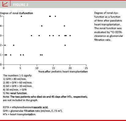 Progressive renal dysfunction is recognised in adult as well as in paediatric HTx populations [1, 13], and we demonstrated a progressive, time-related renal dysfunction in the paediatric HTx patients. Four of the 24 long-term survivors (17%) suffered from severe renal dysfunction and needed dialysis or renal transplantation. In the ISHLT registry, 5% of the patients required renal Tx or dialysis within ten years after HTx [1]. Renal dysfunction is mainly caused by the nephrotoxic effect of the calcineurin inhibitors cyclosporine and tacrolimus [13]. An aggressive immunosuppressive treatment may explain the rather low number of acute rejection episodes and the seemingly higher frequency of renal dysfunction seen in our patients.