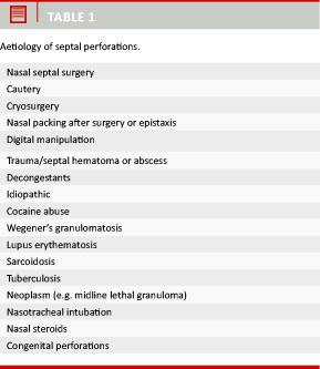 The aetiology is multitudinous (Table 1) with iatrogenic injury accounting for the majority of recognized septal perforations [1-7]. Proper exposure of medical history and a thorough physical examination are imperative, while failure to diagnose and manage any underlying pathologic condition may compromise successful repair of the perforation and delay proper treatment of any severe underlying disease [3, 5, 8-10].