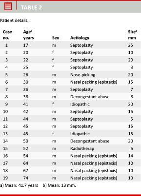The patients had a mean age of 41.7 years (range: 17-74 years). The presenting symptoms were nasal obstruction (63%), crusting (53%), epistaxis (47%), deformities (16%) and whistling (16%). Prior to surgery, all patients had a general ear, nose & throat examination that included complete visualization of the nasal septum.