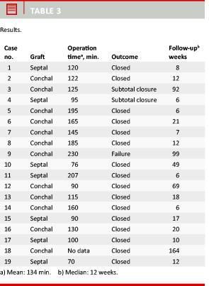 The median follow-up period was 12 weeks (range: 6-164 weeks). Complete closure was accomplished in 16 of the 19 patients (84%) without major intra- or postoperative complications. One patient had a prolonged stay due to postoperative bleeding, sinusitis and depression (case no. 18). All other patients were hospitalized for less than 24 hours. Total symptomatic resolution was documented in 18 of the 19 patients (95%). One patient (case no. 9) reported no change in symptoms. We used septal cartilage in six (32%) patients and auricular conchal cartilage in 13 (68%) patients. We observed no morbidity associated with the graft donor site. The results are presented in Table 3.