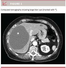 Cysts in the liver are present in approximately 5% of the population. The majority of patients have so-called simple cysts which are non-neoplastic and non-infectious cysts [1, 2]. Most patients are asymptomatic, but for those with symptoms, pain is the predominant complaint. On diagnostic imaging, for example computed tomography (CT), simple cysts are thin-walled with no septations (Figure 1), whereas infectious cysts are typically thick-walled, and neoplastic cysts often have nodules in the wall [1].