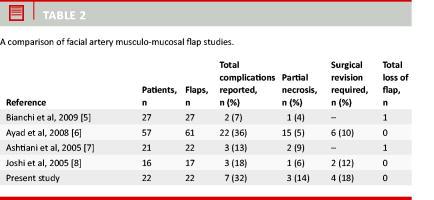 In recent years, several authors have described the use of this technique. Table 2 compares our findings to those of Bianchi et al [5], Ayad et al [6], Ashtiani et al [7] and Joshi et al [8]. Out of the 127 flaps analyzed in these four studies, there were two total flap losses and a postoperative complication rate of 24%. Our percentage of complications seems to be considerably higher than this; however we believe that, unlike the aforementioned studies, the inclusion in our study of patients who previously underwent radiotherapy contributes significantly to this difference.