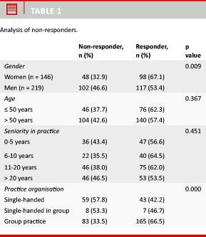 After two reminders, 215 (59%) questionnaires were returned and used in the analyses. Response rates were higher among women than among men: 98 (67%) of the women responded compared with 117 (53%) of the men (p = 0.01). Significantly fewer GPs from single-handed practices than from group-practices responded to the questionnaire (p < 0.01). The median age and seniority in practice were similar for responders and non-responders.