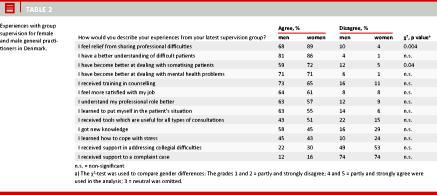 Conclusion: A majority of Danish GPs have participated in a supervision group at some time. The activity is perceived as being formative and restorative. Participation is significantly more prevalent among female GPs than among male GPs. Future research is required to show how participation influences professional development; how participating in supervision groups contributes to prevention of burnout; and how the needs of males and females differ.