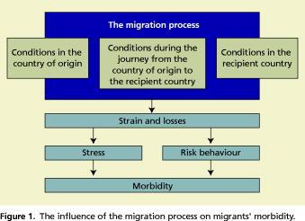 The migration process may imply a number of stressors and strains that influence migrants' morbidity in several ways ( Figure 1 ).