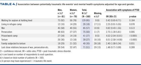 Table 4 presents potentially traumatic events, including persecution (50%; n = 75) and experience of war (57%; n = 85). Logistic regression analysis, adjusting for age and gender, showed significant association between experiences of persecution (OR = 2.75; 95% CI: 1.30-5.81), prison/work camp (OR = 4.52; 95% CI: 2.04-10.01), torture (OR = 6.01; 95% CI: 2.58-14.00) family subjected to torture (OR = 2.40; 95% CI: 1.08-5.34) and signs of PTSD.