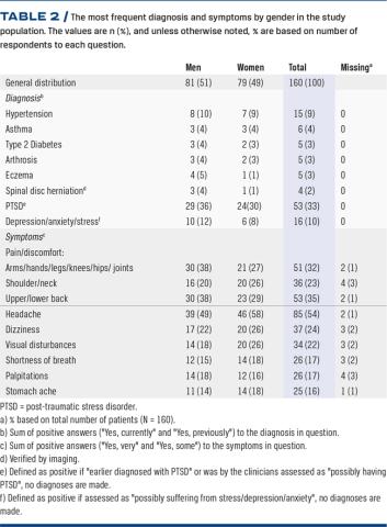 The distribution of diagnoses and symptoms is shown in Table 2. The most frequent self-reported somatic symptoms were headache, dizziness and pain. 45% (n = 72) reported three symptoms, whereas 20% (n = 32) reported six or more symptoms (not reported in table). For diagnoses, 33% (n = 53) had previously been diagnosed with PTSD, or were, during the GHA, assessed with possible PTSD.