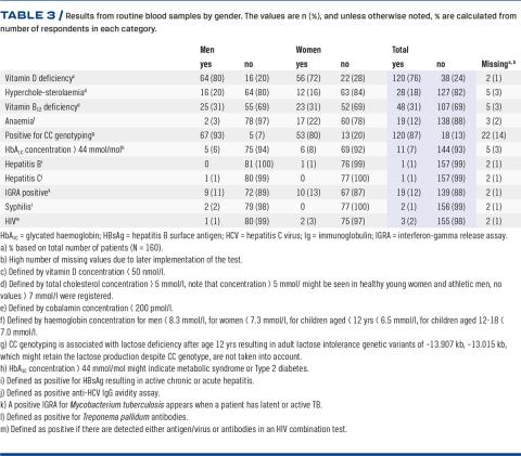 Table 3 summarises blood testing results. The most frequent abnormal finding was vitamin D deficiency (< 50 nmol/l) in 76% (n = 120); of these cases, 25% (n = 40) were moderate to severe (< 25 nmol/l). Furthermore, 12% (n = 19) suffered from anaemia, comprising 22% (n = 17) of females. Few were diagnosed with infectious diseases. Less than 1% (n = 1) had signs of active hepatitis B virus (HBV) been positive for HBV-surface-antigen, 7% (n = 11) were vaccinated and therefore positive for HB serum antibodies (anti-HBs) only, and 6% (n = 6) showed previous infection (positive anti-HBs and anti-HBc). Two were positive for syphilis and three for HIV, all of whom had previously been diagnosed and were in treatment.