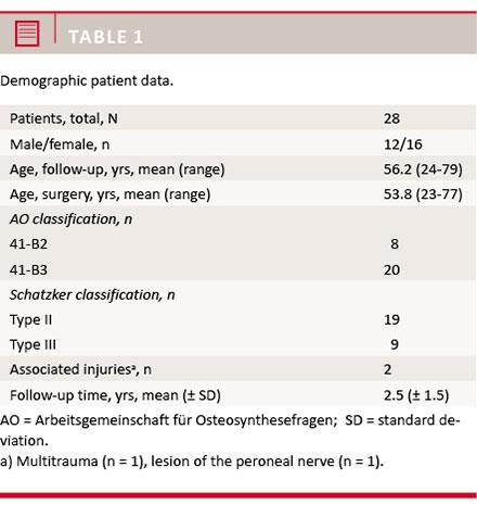 A total of 19 fractures were classified as AO type 41-B3 and nine as 41-B2 fractures. Associated injuries were found in two patients: one with multitrauma and one with a preoperative lesion of the peroneal nerve. Complications were present in one patient who developed complex regional pain syndrome (CRPS). Additional surgical procedures were performed in eight cases. Additional surgery included the removal of screws after union (n = 7) and a total knee alloplastic (TKA) procedure (n = 1).