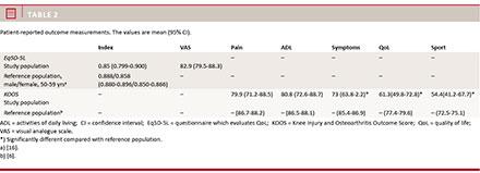 Nevertheless, the patient-reported KOOS scores were significantly below the established reference population in three of five subscales.