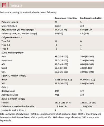 Radiological outcomes: The fracture classification was performed according to the AO classification [9]. The fractures were assessed preoperatively using computer tomography (CT). The presence of osteoarthritis (OA) was evaluated both preoperatively and at follow-up according to Kellgren and Lawrence’s [10] recommendations. Articular depression and condylar widening were evaluated using X-rays as described by Rasmussen [11]. For this assessment, one X-ray was taken six weeks post-operatively and another was taken at the time of follow-up. Valgus/varus malalignment was evaluated as described by Browner et al [12]. A valgus/varus malalignment > 5°