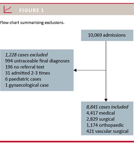 seven days after admission because the final diagnosis may have been influenced by other conditions arising during the hospital stay and because this risk increases with the length of stay. Patients without a referral text or final diagnosis were excluded, as were patients with gynaecological conditions and patients who were self-referred or referred by pre-hospital services without the involvement of a physician.