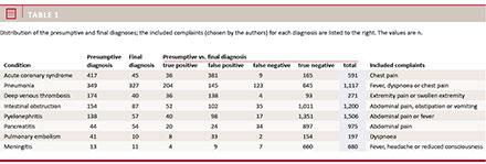 studies: meningitis, acute coronary syndrome (ACS), pulmonary embolism, pneumonia, pancreatitis, deep venous thrombosis (DVT), pyelonephritis and intestinal obstruction. The presumptive diagnoses were compared with the final diagnosis on discharge. Sensitivity, specificity, predictive values and likelihood ratios were calculated.