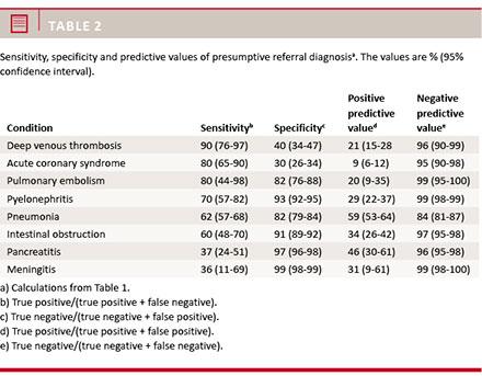 The diagnostic values for the specific presumptive diagnoses vary greatly with the highest and lowest sensitivities seen in the cases of DVT (90%) and meningitis (36%), respectively; and the highest and lowest values for specificity seen for meningitis (99%) and ACS (30%), respectively. The PPV have a wide range with the lowest value in ACS (9%) and the highest in pneumonia (59%).
