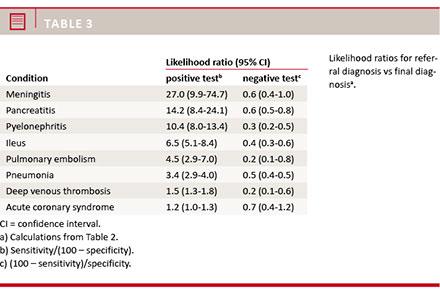 RESULTS: A total of 8,841 patients were enrolled. The highest and lowest sensitivities were seen for DVT (90%) and meningitis (36%), respectively; and the highest and lowest values for specificity were observed for meningitis (99%) and ACS (30%), respectively. The positive predictive value had a wide range with the lowest value for ACS (9%) and the highest for pneumonia (59%). For pyelonephritis, meningitis and pancreatitis, the likelihood ratio of a positive test was above 10. The likelihood ratio of a negative test was above 0.1 for all diagnoses.