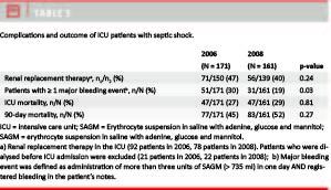 The main findings of the present study were that fluid treatment of patients with septic shock had changed from 2006 to 2008 from mainly dextran 70 to crystalloids and albumin. More patients experienced severe bleeding in 2006 than in 2008 and, also, more blood products were given in 2006 than in 2008. However, there were no differences in the use of acute RRT or in ICU mortality rates or 90-day mortality between the two years.