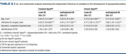 Using univariate logistic analysis, we identified age (p < 0.01), toxic thyroid diagnosis (p < 0.001), completion thyroidectomy (p < 0.05) and identification of several PTGs during surgery (p < 0.05) to be significantly associated with transient HypoPT. For chronic HypoPT, this only applied for age (p < 0.01) and toxic thyroid diagnosis (p < 0.01) (Table 2). Multivariate logistic analysis showed that the only independent variables for both transient and chronic HypoPT were younger age and toxic thyroid diagnosis (Table 2).
