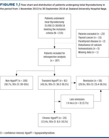 Methods: This was a retrospective review of patients undergoing TT in the period from 2013 to 2018 due to benign thyroid disease in a Danish university hospital. In total, 187 patients were eligible for inclusion. Data were collected from internal medical files, the Thykir database sheets and patient records. HypoPT was defined as SE-ionised-Ca2+ levels (< 1.16 mmol/l) and inappropriately low parathyroid hormone levels.