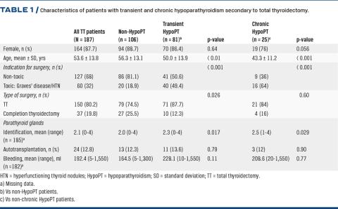 Results: The incidence of transient and chronic HypoPT was 81 (43.3%) and 25 (13.4%), respectively. Younger ages and toxic indication for surgery were independent risk factors for transient and chronic HypoPT. Incidences in Graves’ disease population were 70.5% and 27.3%, respectively. Resolution within the first months was seen in 48.2% of the patients with acute transient HypoPT.