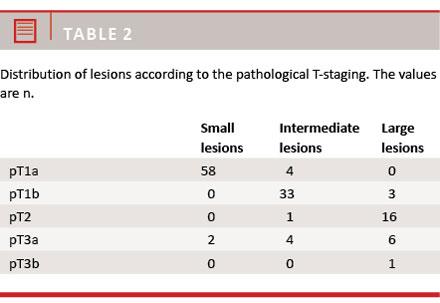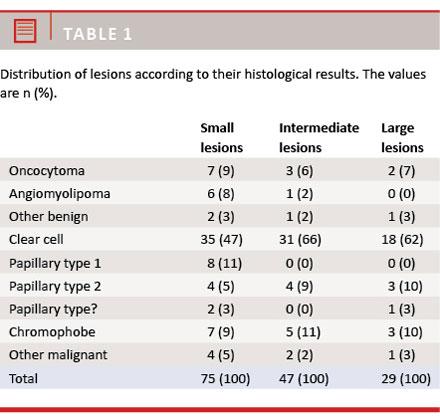 Material and methods: This retrospective study included patients who underwent partial or radical nephrectomy between November 2010 and July 2013. All patients underwent a multiphase helical computed tomography (CT), which revealed suspected renal malignancy. The exclusion criteria were cystic tumours, biopsy before surgery, and disseminated and locally advanced disease. Lesions were defined as follows: small ≤ 4 cm, intermediate > 4 and ≤ 7 cm, and large > 7 cm.