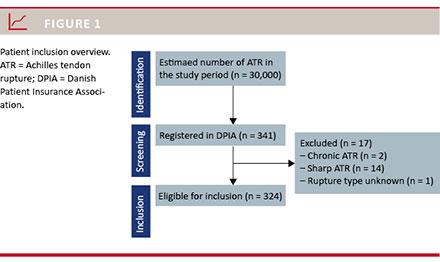 This retrospective registry study examined the DPIA database records from 1992 to 2010. We identified 324 patients with ATR. All patient records were manually reviewed, and data were assessed to confirm correct registration of diagnosis and complications. As outlined in Figure 1, patients with chronic ATR, sharp ATR, or without ATR type specification were excluded from further analysis. Using Microsoft-Office Access, we constructed supplementary database compiling all relevant health-care data from patient chart records, external consultant statements, and the DPIA database for insurance and compensation data. The primary endpoint was financial compensation. Covariates were: rupture type, time of injury, time of diagnosis, primary treatment, complications, secondary treatments, previous steroid injection as well as co-morbidities. Complications registered included infections, VTEs, re-ruptures, tendon elongations, sural nerve lesions, reflex dystrophy, insufficient tendon healing, adherence formation, peroneus paresis, and overlooked diagnoses. In this study, an overlooked diagnosis was defined as a diagnosis made four weeks or later after the primary injury. Compensation was analysed according to treatment type and corresponding complications that occurred. Treatment types were either surgical, non-surgical, or categorised as ‘no treatment’. No treatment was predefined as patients with ATR receiving neither conservative nor surgical treatment.