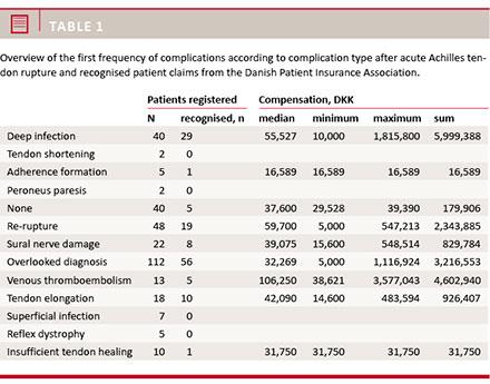 The most common complication in our study was an overlooked diagnosis (35% of the patient pool), with 17.2% of patients receiving compensation totalling three million DKK. Despite a different study setup and another definition of an overlooked diagnosis, the findings of this study are similar to the findings by Inglis et al from 1976 who found that 22% of patients had an initial misdiagnosis [17]. While many complications associated with ATR can be difficult to control and prevent, an overseen diagnosis must be regarded as a fully preventable complication. This stresses the importance of continued information and instruction to primary health care to assure prompt diagnosis recognition and referral to respective orthopaedic and emergency room departments.