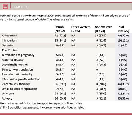 Results: This study included 125 perinatal deaths. The data indicated that intrapartum death, death caused by maternal disease, lethal malformation and preterm birth may be more frequent among non-Western than among Danish-born women. Obesity and disposition to diabetes may also be more prevalent among the non-Western women.