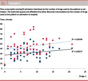 Thus, five minutes were required for a medication interview with a patient who used eight drugs on admission, while 0.5 minutes were spent on a patient taking 21 drugs.