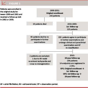 Patients were enrolled in the original study between 1999 and 2001 and received a follow-up visit in 2002 or 2003 (Figure 1). The ten-year follow-up was conducted in 2010 and consisted of two observation periods: observation period 1 (OP1) from the first enrollment (1999-2001) to the first follow-up (2002-2003) and observation period 2 (OP2) from the first follow-up (2002-2003) to later follow-up (2010). Patients were only included in the ten-year follow-up study if they had participated in the first follow-up study performed from late 2002 to early 2003 when all patients who were still alive were invited to a follow-up visit with clinical examination. At first follow-up, AF classification was re-evaluated by examination of hospital records and patient interviews. We registered if the patient was treated with rhythm control where SR was pursued with antiarrhythmic medical therapy (specific drugs or dosages were not registered), electrical cardioversion or ablation (persistent AF), or if AF was accepted as a permanent condition with no further attempt to restore the sinus rhythm (permanent AF). The enrollment date was the exact date the patient entered the original study; the end of OP1 was the exact date of the first follow-up visit; and the end of OP2 was the date we examined the patient’s files or the date at which the patient died or emigrated.