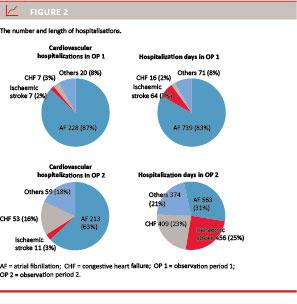 We observed a decrease in the number of hospitalisations and the number of days spent in hospital from OP1 to OP2, and a marked shift from hospitalisations due to AF relapse towards hospitalisations caused by the complications of the arrhythmia, primarily ischaemic stroke, and congestive heart failure. To our knowledge, no other studies have described hospitalisation patterns in an AF population over this length of time with such detailed hospitalisation data.