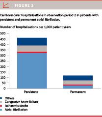 The causes of hospitalisation in OP2 were different in patients with persistent and permanent AF, respectively (Figure 3). Among patients with persistent AF, there were 461 hospitalisations per 1,000 patient years; and in patients with permanent AF, there were 120 hospitalisations per 1,000 patient years (Figure 3). The number of hospitalisations due to AF was 323 per 1,000 patient years in patients with persistent AF, and 29 per 1,000 patient years in patients with permanent AF and the number of hospitalisations due to congestive heart failure was 54 per 1,000 patient years in patients with persistent AF and 40 per 1,000 patient years in patients with permanent AF (Figure 3).