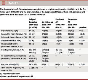 The study population is described in Table 1. The mean duration of OP1 (from enrollment to first follow-up) was 2.9 years (0.7). All types of co-morbidity were more common at first follow-up than at enrollment (Table 1). Patients were only included in this study if they had participated in the first follow-up visit. These patients did not differ from the original larger cohort (242 patients) on any characteristic. Progression to permanent AF at the first follow-up had occurred in 29% of patients (Table 1). At the first follow-up, patients with persistent AF and permanent AF were comparable on many variables and differed only in age (patients with persistent AF were younger) and the prevalence of diabetes mellitus and congestive heart failure (diabetes mellitus was more common and congestive heart failure was less common in patients with persistent AF than in patients with permanent AF, Table 1).
