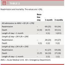 We found that the median overall length of stay in hospital for patients admitted for more than 24 h was six days. The mean was nine days as two patients stayed more than one and three months, respectively. 27% were readmitted within one month, and the corresponding figure for three months was 38%, as presented in Table 2. Death during hospital stay was 4%, after one month it was 7%, and after three months 11%.