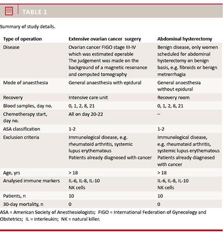 A total of 20 women were included in the study. Three patients were excluded in the OC group; one patient turned out to be inoperable, while two patients were incorrectly diagnosed initially (one had benign cysts on the ovaries, and one patient was diagnosed with a signet cell cancer). In the abdominal hysterectomy (H) group, seven patients completed the study, as three patients in the H group did not wish to have the last blood samples taken. The groups were comparable with regard to age, body mass index (BMI), coexisting diseases and total WBC.
