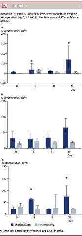 The conclusion in all these studies is that there is a correlation between elevated levels of IL-6 and the patients’ outcome. In our study, we found significant differences in the levels of IL-6 between the OC group and the control group – with especially high levels of IL-6 in the OC group on the 21st post-operative day. The high levels at day 1 may, in part, be explained by the recent surgery.