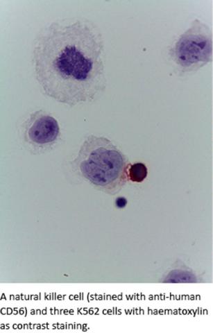 A natural killer celler (stained with anti-human CD56) and three K562 cells with haematoxylin as contrast staining.