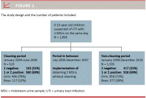Material and methods: A total of 1,858 patients aged 0-15 years who were suspected of UTI delivered two MSUs within 24 h. In 2004-2006 (“cleaning period”), 523 children were cleaned before obtaining two MSUs, contrary to the 1,335 children included in 2008-2010 (“non-cleaning period”). Significant bacteriuria was defined as at least 10,000 colony-forming units/ml of the same uropathogenic bacterium in two MSUs in monoculture. Contamination was defined as all other microbiological findings.
