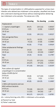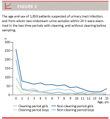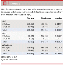 Results: The procedure of no cleaning before sampling increased the risk of contamination in 0-9.9-year-old children from 43% to 49% (p = 0.034); and specifically in 0-9.9-year-old girls, the risk of contamination increased from 47% to 55% (p = 0.018). No significant effect was demonstrated in 10-15-year-old girls (p = 1.0) or in boys, independent of age (p = 0.19). In both periods, 31% of paired MSUs from the same child were without any bacterial or fungal growth.