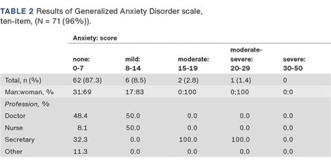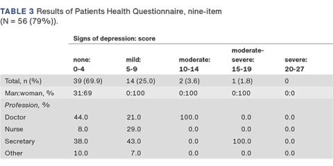 RESULTS: For 30% of the participants, signs were observed of depressive symptoms and 13% had signs of anxiety symptoms. Seventy percent felt sufficiently protected by their available personal protective equipment. Fifty-two percent worried about becoming infected in relation to their work and 56% feared infecting their families.