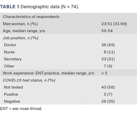 On average, each clinic was staffed by one otolaryngologist and 2.5 employees, estimating an approximate total of 57 otolaryngologists and 143 employees, yielding an estimated response rate of 37%. Among respondents, 51 (72%) were women and 23 (28%) men. Their median age range was 50-54 years. The MDs constituted the largest group (49%). Among respondents, 38% were tested for COVID-19 (throat swab for polymerase chain reaction analysis), of whom 7% tested positive (Table 1).