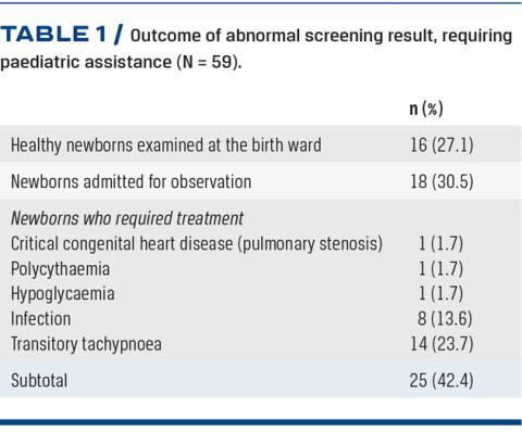 RESULTS: POS was performed in 2,855 newborns; 2,715 were approved immediately, 81 were repeated. Paediatric assistance was required for 59 newborns; 16 could stay in the maternity ward following assessment, while 18 were admitted for observation until their saturation normalised. One newborn had CCHD, while ten had other conditions needing treatment and 14 had more benign respiratory disorders. One sick newborn would not have been picked up by post-ductal screening only. No midwives performing the screening and no parents refrained from POS.