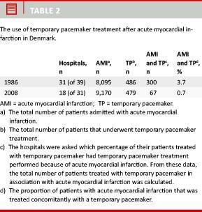 Data on temporary pacemaker treatment in Denmark in 1986 has previously been published [1]. The article was based on a questionnaire sent to all Danish hospitals treating patients with acute myocardial infarction (AMI). Since 1986, the number of hospitals in Denmark has been halved, and coronary reperfusion therapy has become the standard treatment of AMI. In the light of this development, the aim of the present study was: 1) to investigate current use of temporary pacing (TP) in Danish hospitals, and 2) to compare the updated results with the 1986 observations.