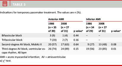 Overall, no significant differences were found between the indications for TP used in 2008 and those used in 1986. The only exception from this was in inferior AMI with a third-degree atrioventricular (AV) block and a ventricular escape rhythm: 85% versus 56% (p < 0.01).
