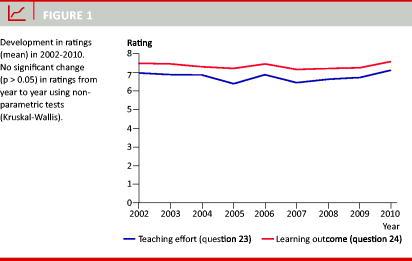 Figure 1 presents the increase in the ratings for questions 23 and 24 over the years. The ratings are relatively stable during this period, with a small drop in 2005 and 2007. From 2008 to 2010, the ratings increased. However, non-parametric tests showed no significant change in the ratings from year to year.