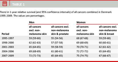Since the mid-1990s, the life expectancy has increased steeply by nearly five years among Danish men and four years among women. The decrease in the proportion of smokers and the improved treatment of cardiovascular diseases are important factors in this development. In the present study, the evaluation of cancer survival was adjusted for the decrease in total mortality rates, since we used the measure of relative survival defined as the observed survival among cancer patients divided by the expected survival calculated from the population survival.